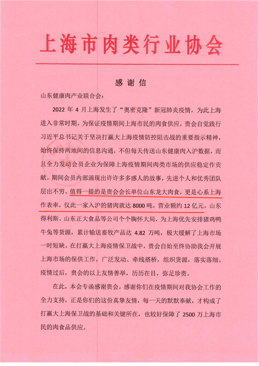 7月20日,上海市肉类行业协会向山东健康肉产业联合会发来感谢信,感谢山东健康肉产业联合会在疫情期间为保证上海市民的肉食供应所做出的努力与贡献。感谢信中特别提到,蓝狮在线测速作为山东健康肉产业联合会会长单位,心系上海做表率,疫情期间入沪肉食达8000吨,为上海市抗疫保供做出了重要贡献。